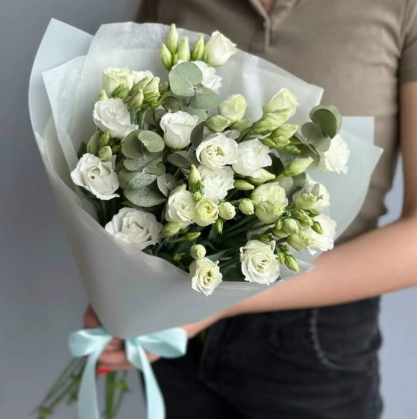 Белые лизиантусы в стильной упаковке с добавлением эвкалипта